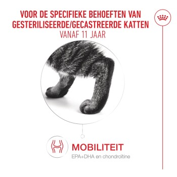 ROYAL CANIN® AGEING 11+ STERILISED is een droogvoer voor gesteriliseerde katten vanaf 11 jaar. Deze formule biedt een precies uitgebalanceerde mix van voedingsstoffen die helpt om hun gezondheid en vitaliteit op oudere leeftijd te behouden.